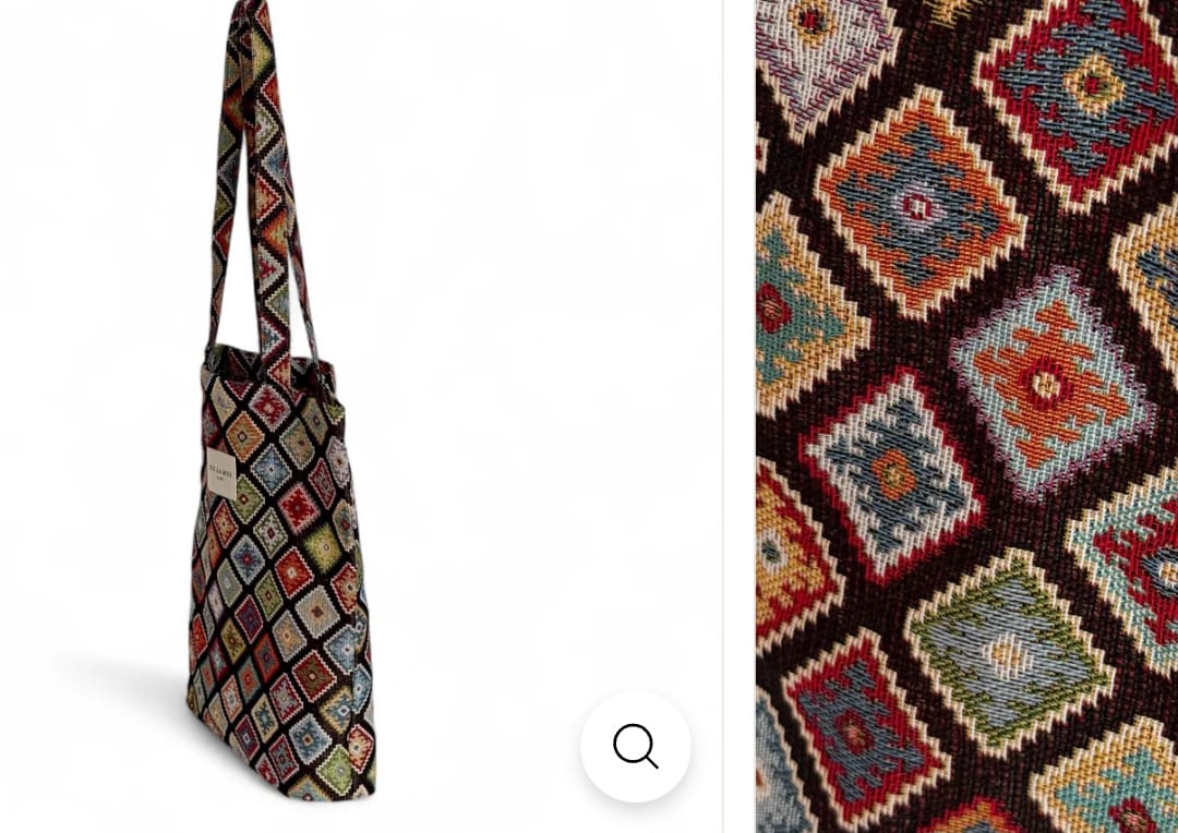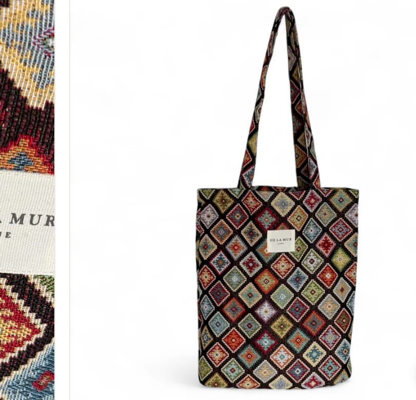 Bolsito de tela estampado estilo «Tote bag». Para su correcto mantenimiento se aconseja lavarlo en frío y no utilizar secadora. Ancho 36cm x 39 cm de alto. Confeccionado en España con tejidos nacionales, en su mayoría compuesta por algodón. Varios modelos identificados por nombre.