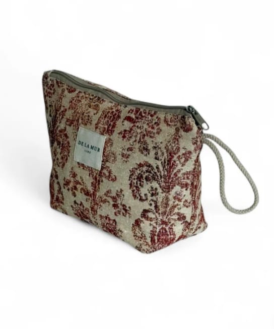 Neceser con cremallera en la parte superior y asa de cordón de color beige en el lateral. Con estampado original y forro interior de tela gruesa. Marca DelaMur . Hecho en España.