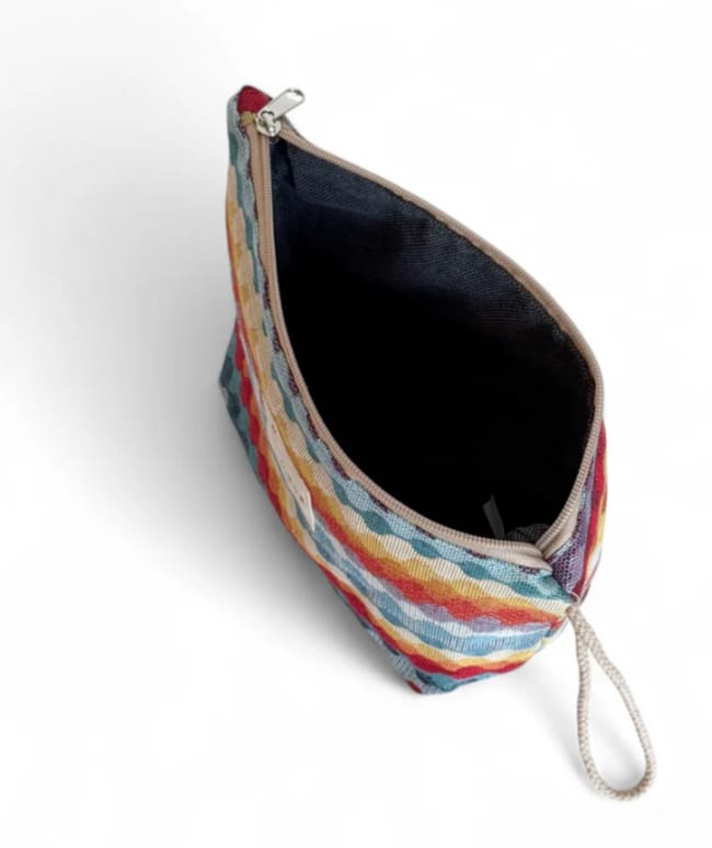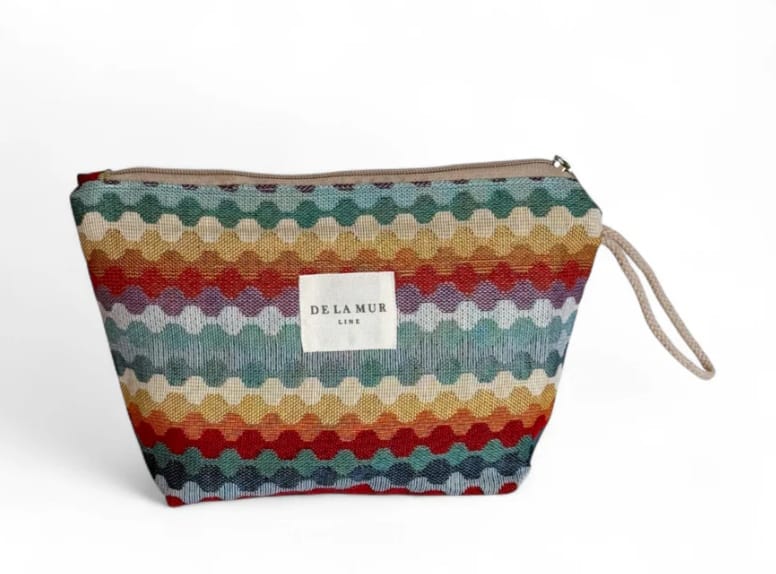 Neceser con cremallera en la parte superior y asa de cordón de color beige en el lateral. Con estampado original y forro interior de tela gruesa. Marca DelaMur . Hecho en España.