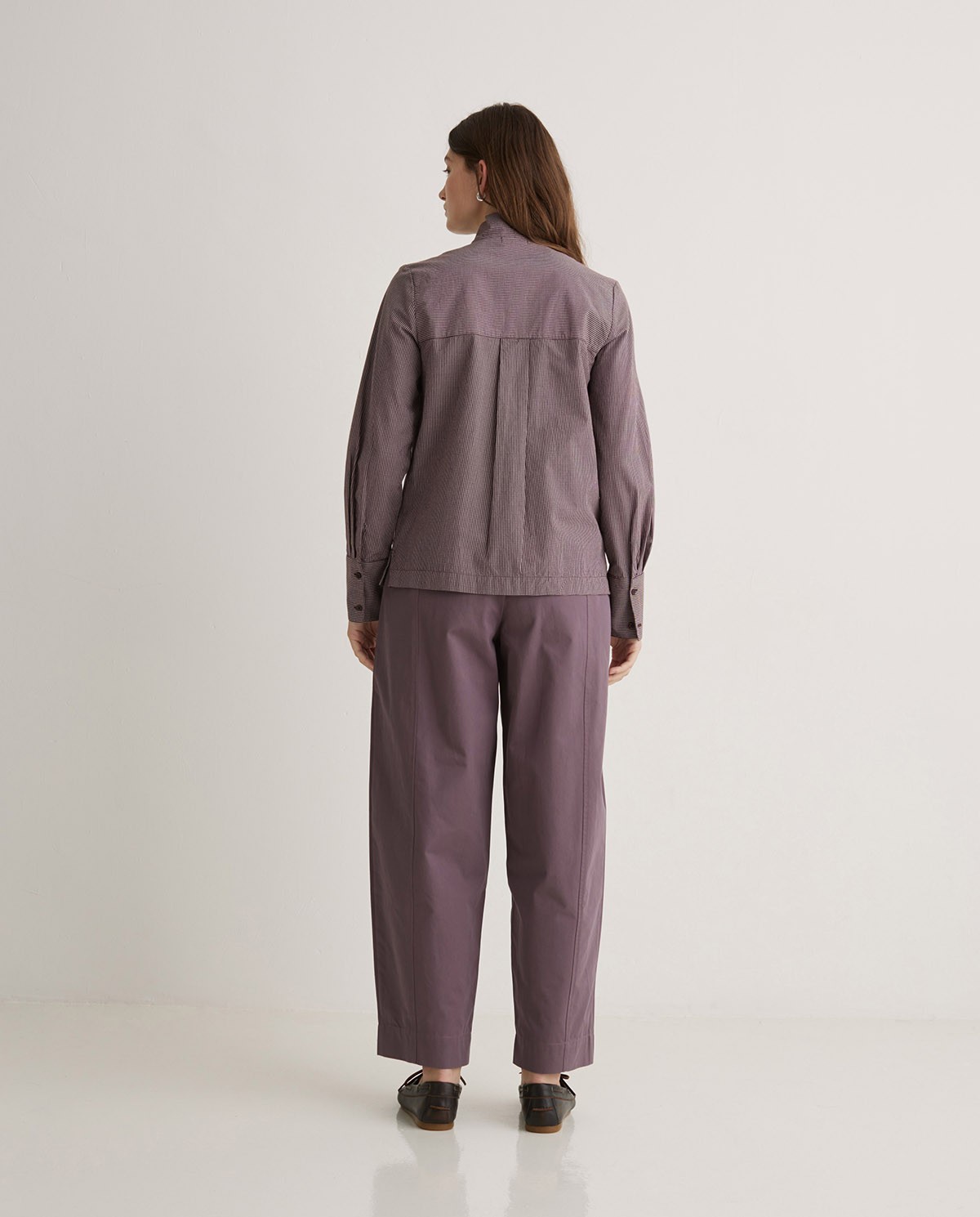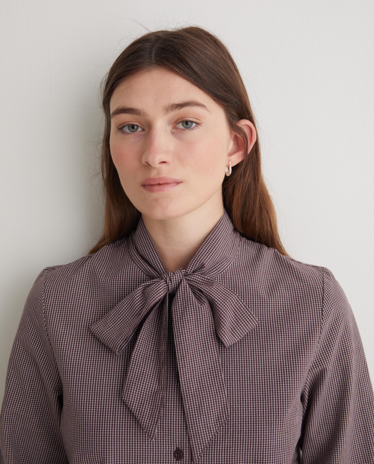 Regular fit. Camisa estampada de cuadros. Cuello redondo con lazo anudable. Manga larga. Puños abotonados. Cierre con botones. Logo bordado en bajo. Detalle pinza en la espalda. Altura modelo 175 cm, talla S. Marca Yerse. Barcelona.