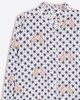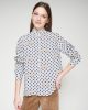 Camisa blanca con estampado repetido de estrellas en azul marino y figuras de leopardos. Cuello subido con pequeño volante. Cierre frontal con botones. Manga larga acabada en puño. Corte recto. La modelo mide 175 cm. Marca Vilagallo.
