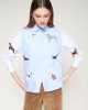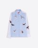 Camisa de rayas finas celestes y blancas con bordados de distintos perros repartidos por el delantero y las mangas. Cuello camisero clásico, cierre frontal con botones visibles. Corte recto. Tejido de algodón de tacto ligero y fresco. La modelo mide 174 cm. Marca Vilagallo.