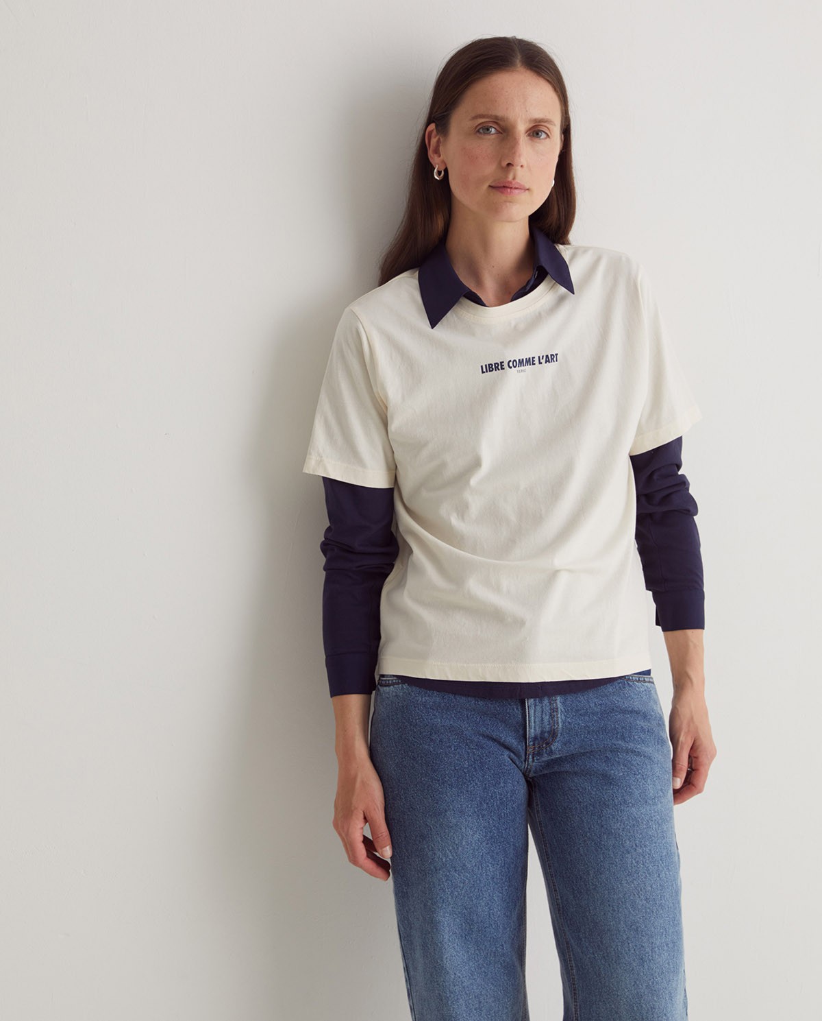 Camiseta con frase estampada en el pecho. Regular fit. Cuello redondo. Manga corta. Altura modelo 175 cm, talla S. Marca Yerse. Barcelona.