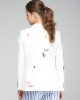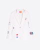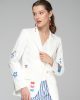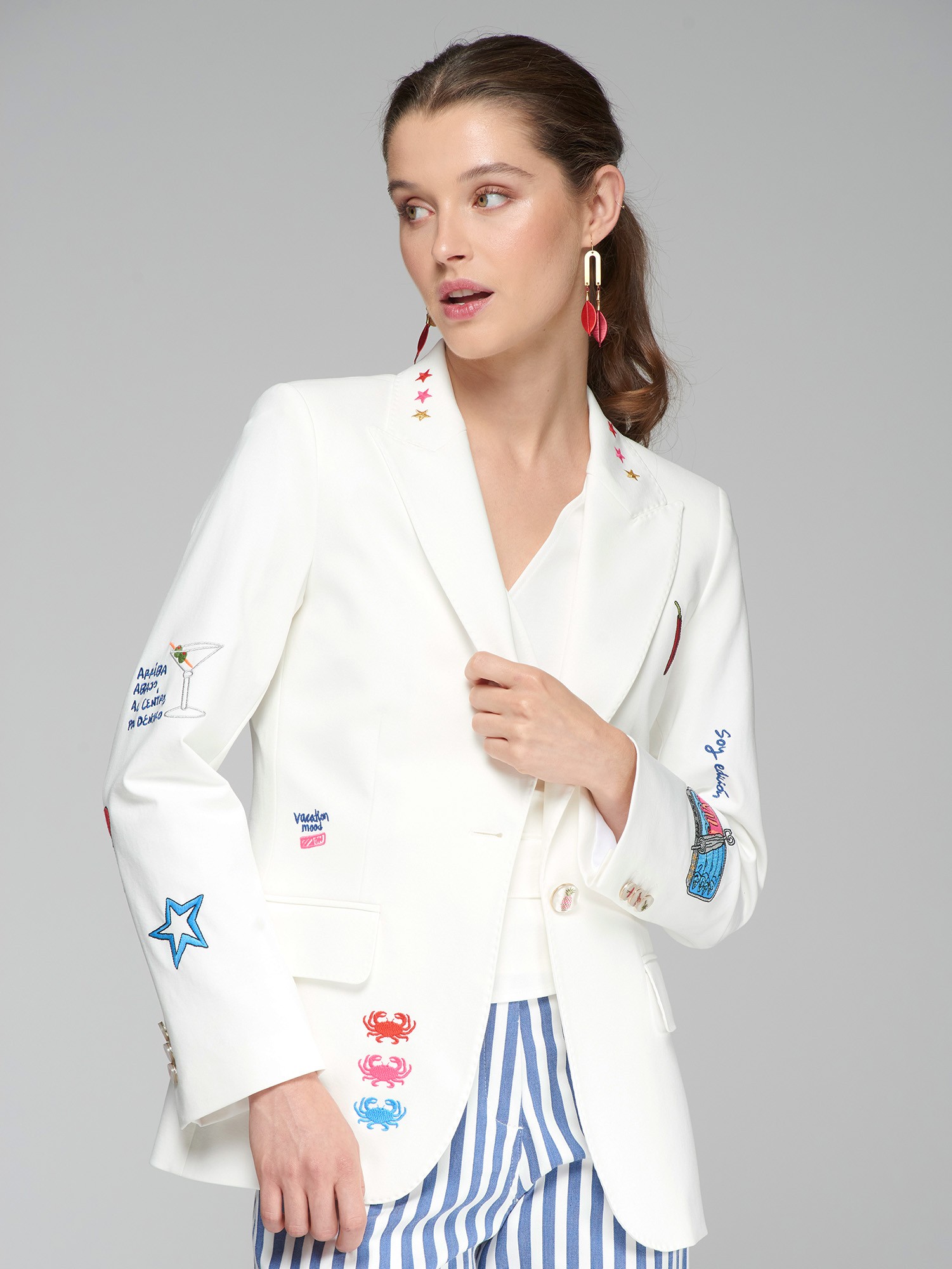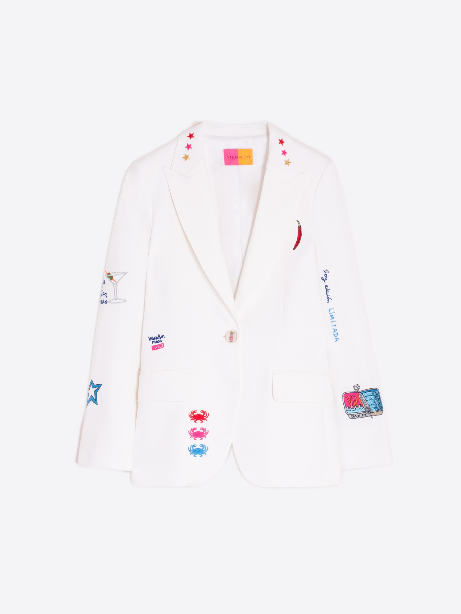 Blazer blanca con bordados de aperitivos exclusivos Vilagallo. Cierre frontal con botón decorativo con una piña. Bolsillos con solapa. Bolsillos delanteros. Pantalón a conjunto disponible. La modelo mide 1,72 y lleva la talla 38.Forro interior. Marca Vilagallo. Diseñado y fabricado en España.
