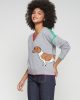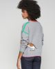 Jersey de punto gris con diseño intarsia de perro salchicha a ambos lados. Cuello pico con ribete rosa, detalle verde en hombros y puños. Tejido 100% lana con textura suave y estructura ligera. Bajo recto con terminación en rosa. Corte recto con caída natural.