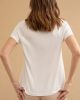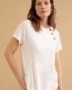 Camiseta básica en blanco con cuello barco. Destaca por su botonadura en la sisa de la manga raglán, aportándole un toque original que la hace única. La modelo lleva la talla S